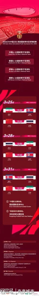 近日,中国足协发布公告,2026CFA中国之队西安国际青年足球锦标赛将于2026年3月25日、3月28日、3月31日在西安国际足球中心和沣东足球公园东场举行。古城西安春暖花开时节,亚洲足坛四支U23国家队将集结国足福地西安国际足球中心,再展青春足球亚洲精彩,提前热身2026日本名古屋亚运会足球项目比赛。