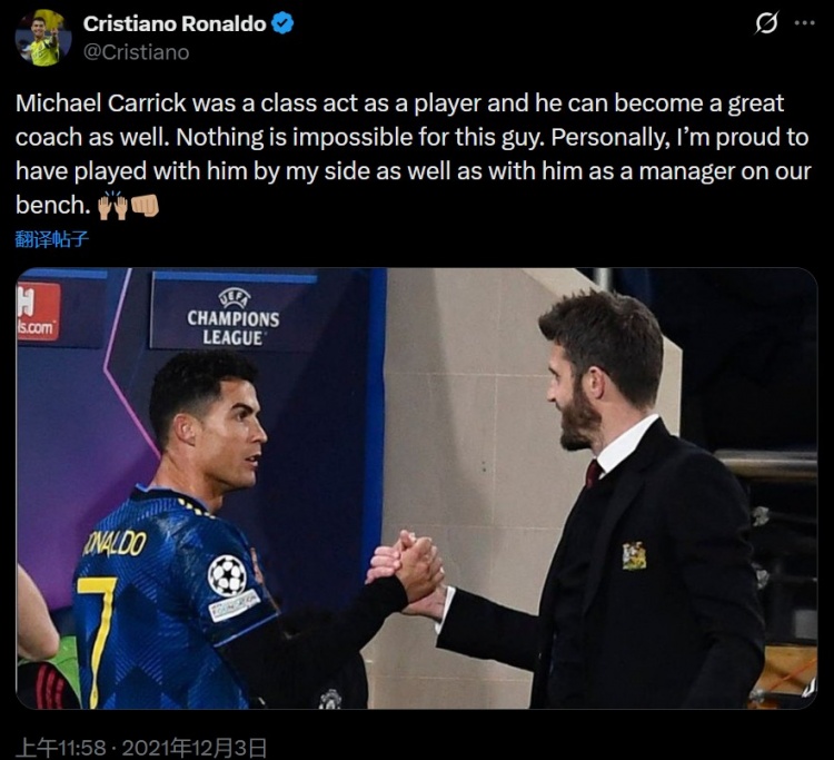C罗在2021年曾经高度评价作为教练的卡里克,他写道:“卡里克在球员时代就是一位顶级球员,他同样可以成为一名伟大的教练。对于他来说,没有什么是不可能的。就个人而言,我曾与他并肩作战,也曾在他的麾下效力,这令我深感自豪。”